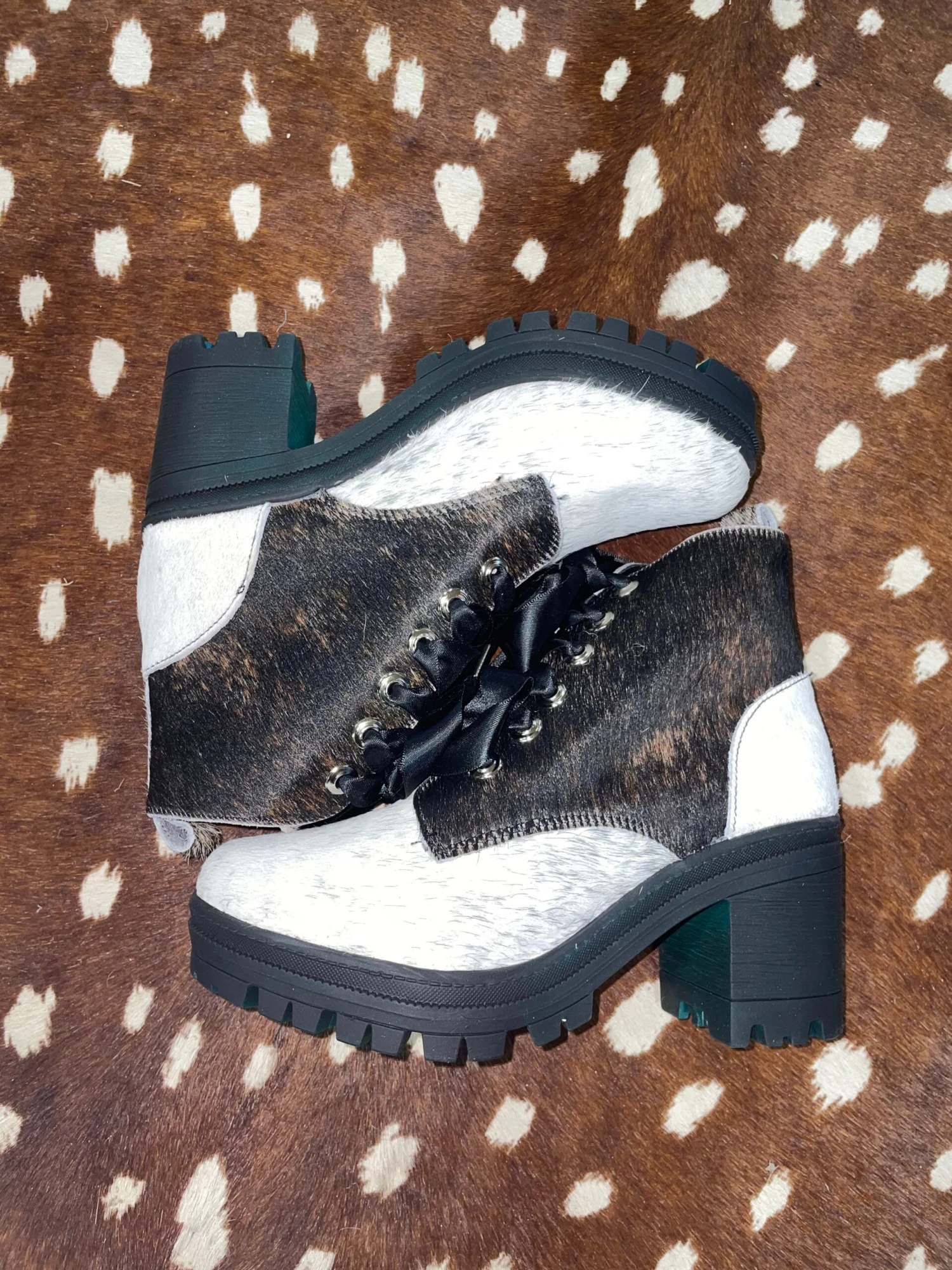 The Alondra Cowhide Combat Boot will instantly become your favorite pair and pictures DO NOT DO THEM JUSTICE! THEY ARE THE MOST GORGEOUS BOOTS! It’s a classic combat boot that has been reinvented with Alcala’s signature cowhide leather. Made of hair on leather, these cool combat boots have block heels for a little extra height. Â Not all cowhide is the same!