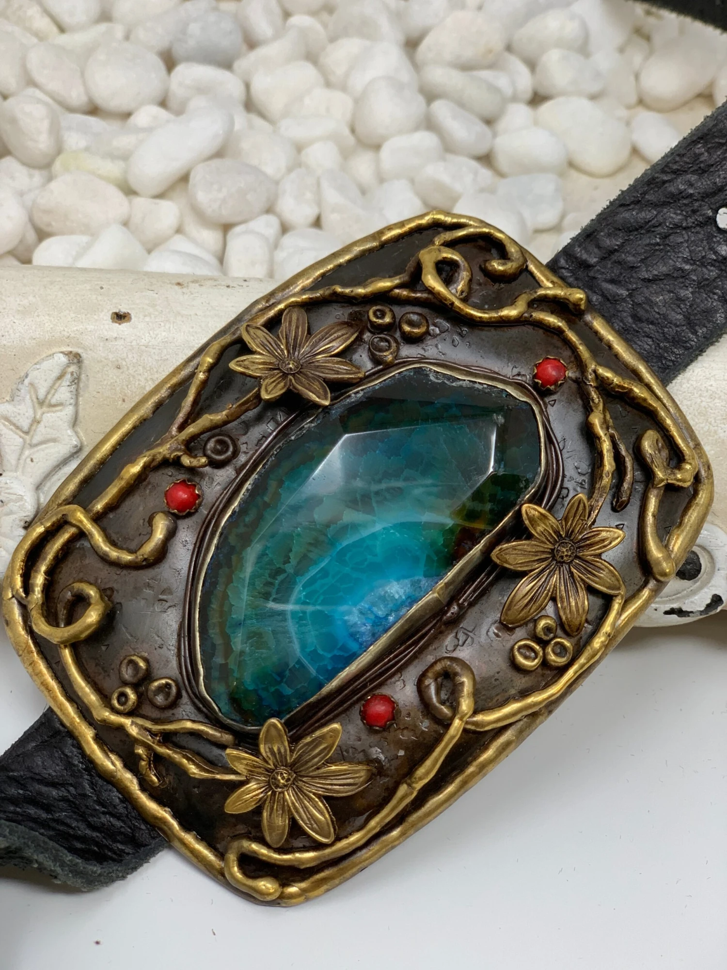 These beautiful square concho’s feature steely blue stones & delicate gold flowers with just a touch of red – the combination of colors on this belt is truly out of this world.