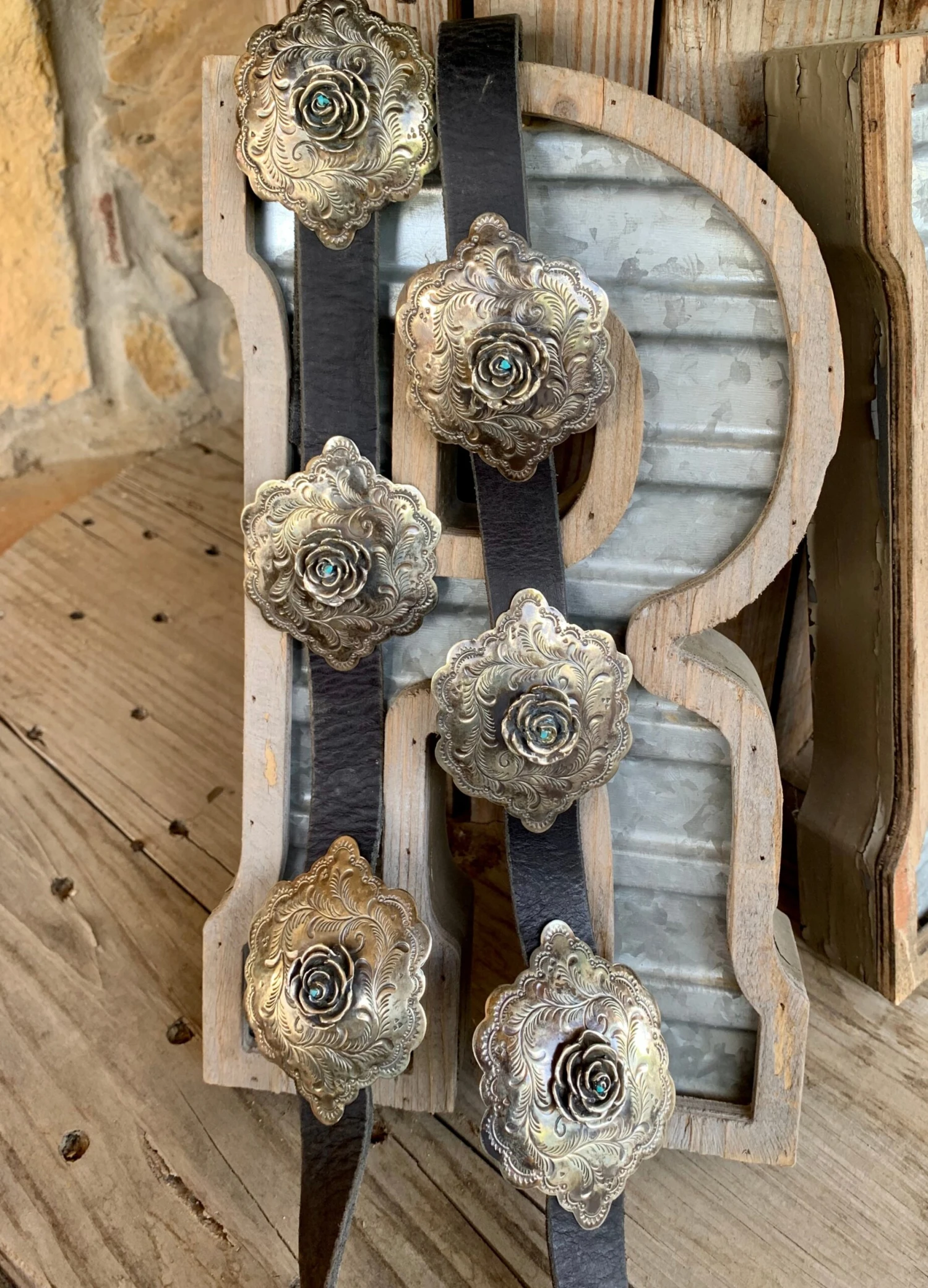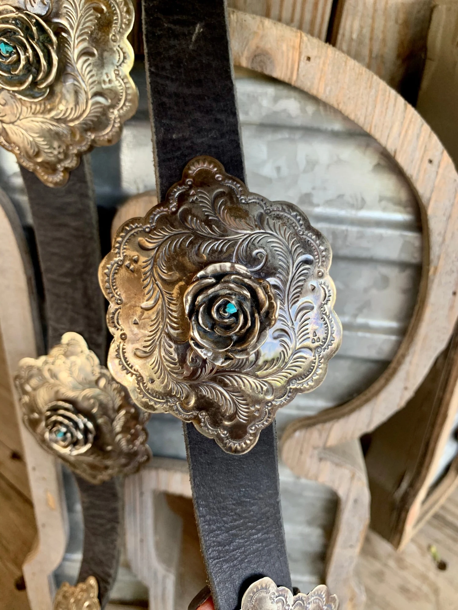 A black leather band with a elegant feather engraving that surrounds a 3D rosette with a stud of turquoise in the middle. it has 6 conchos including the buckle.