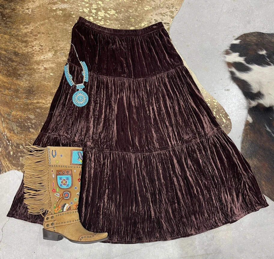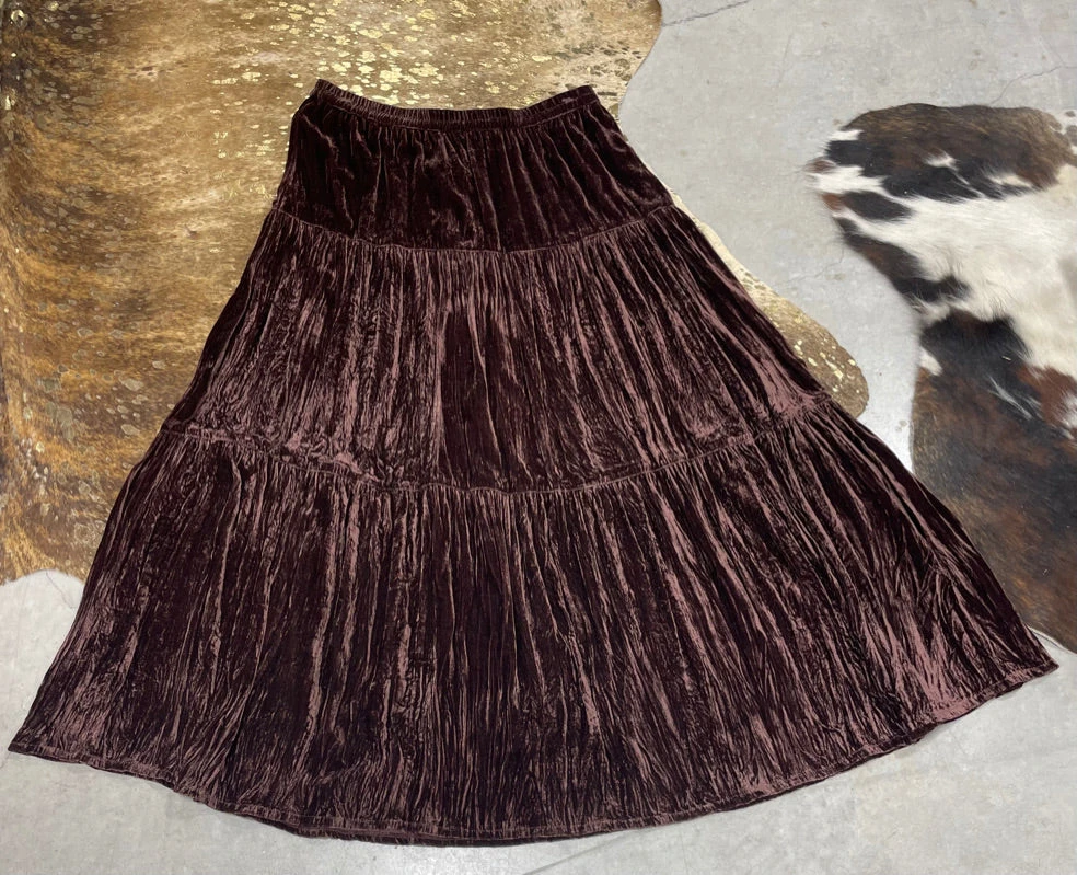 Broom skirts just got even better. This gorgeous three-tiered velvet skirt has amazing texture and fabulous movement; it’s classic, seasonless, and timeless, and you can rock it to brunch, the boardroom, or boot-scootin’! Skirt features an elastic wait with side zipper.Â