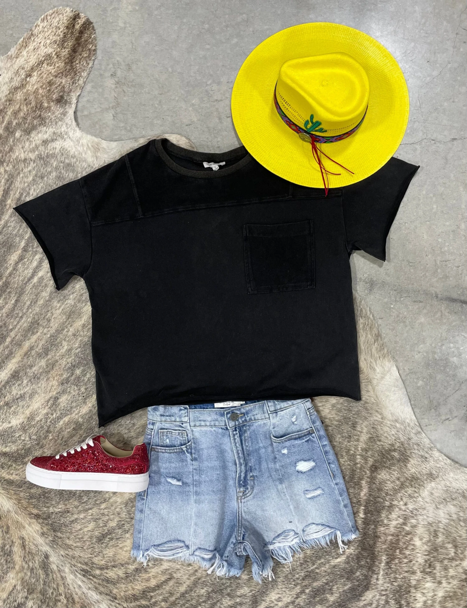 Check out this loose fitting black tee! It is so soft & roomy. Our classic pocket tee is perfect for your girls day out! We are digging the raw edges to sleeves and shirt bottom. Grab yours today!Â