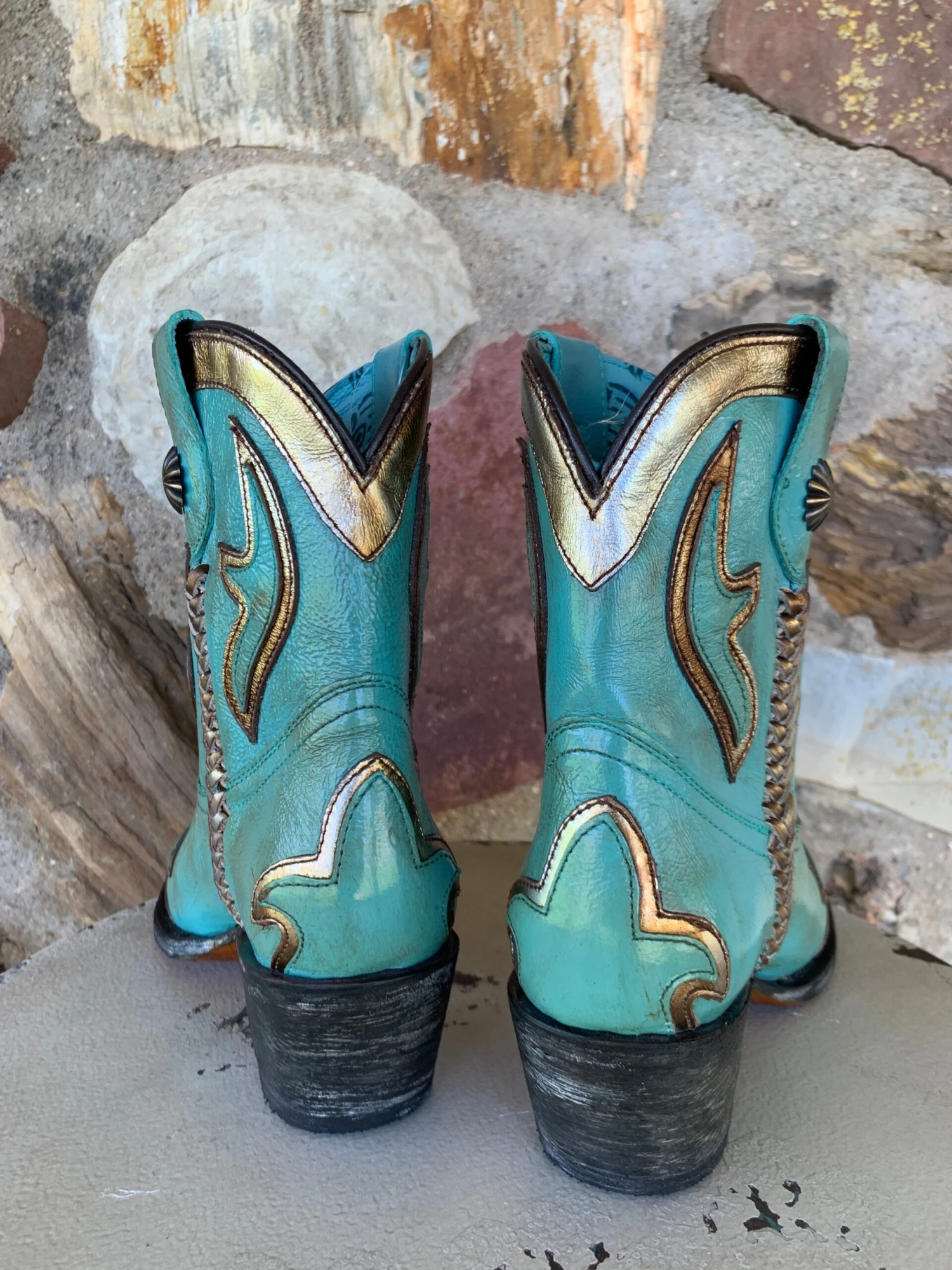 Have you ever seen a bootie this perfect?!? These boots give us major Miranda Lambert vibes! They are turquoise with an antique wash and gold metallic accent designs. The braid down both sides is the icing on the cake!!!Â