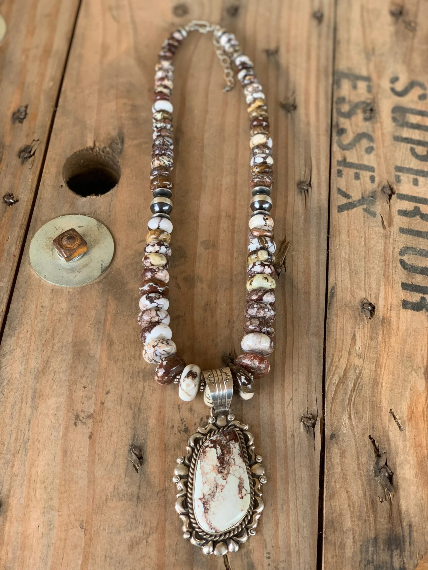 Necklace: 22.5” of beautifully polished hand strung Crazy Horse Stones, with the addition of 2 perfectly placed sterling silver Navajo Pearls.