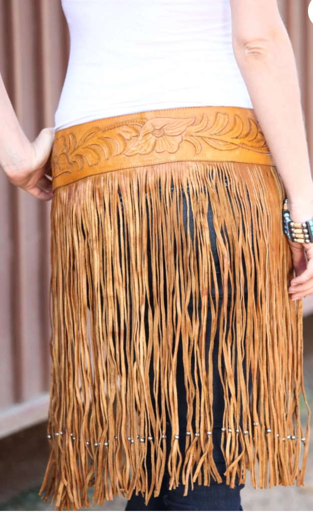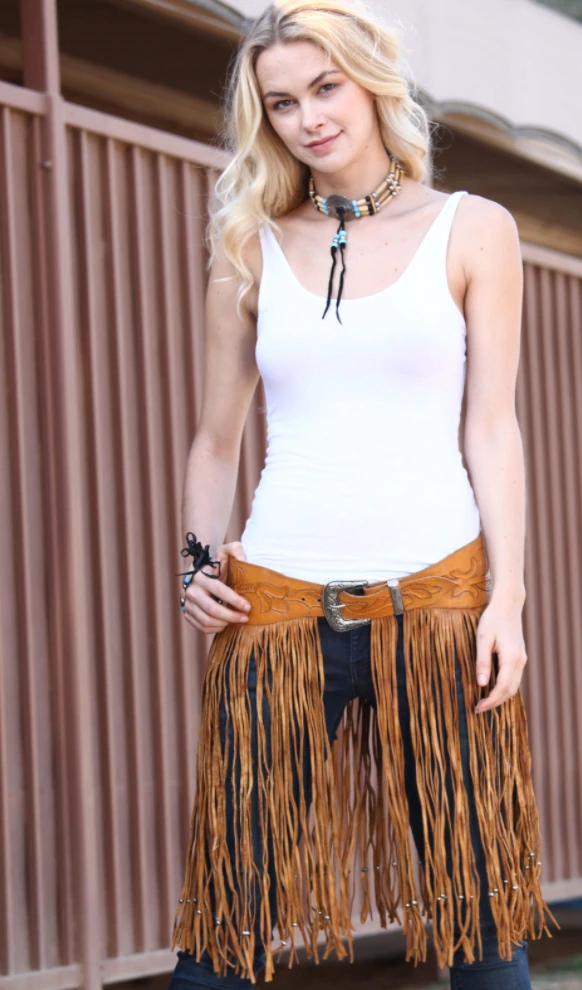Amazing western belt with fabulous fringe hanging! This belt features beads at the bottom of the fringe. Throw this on over any outfit for the perfect accessory!Â