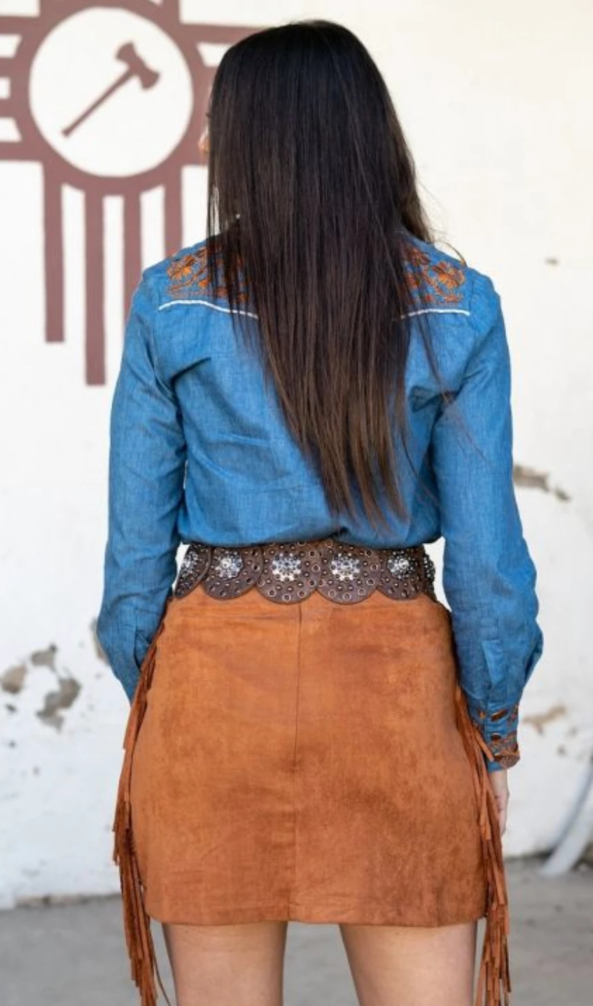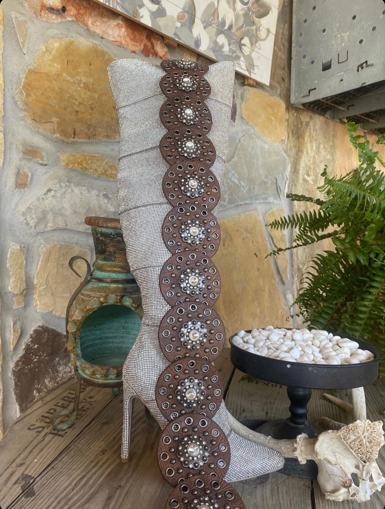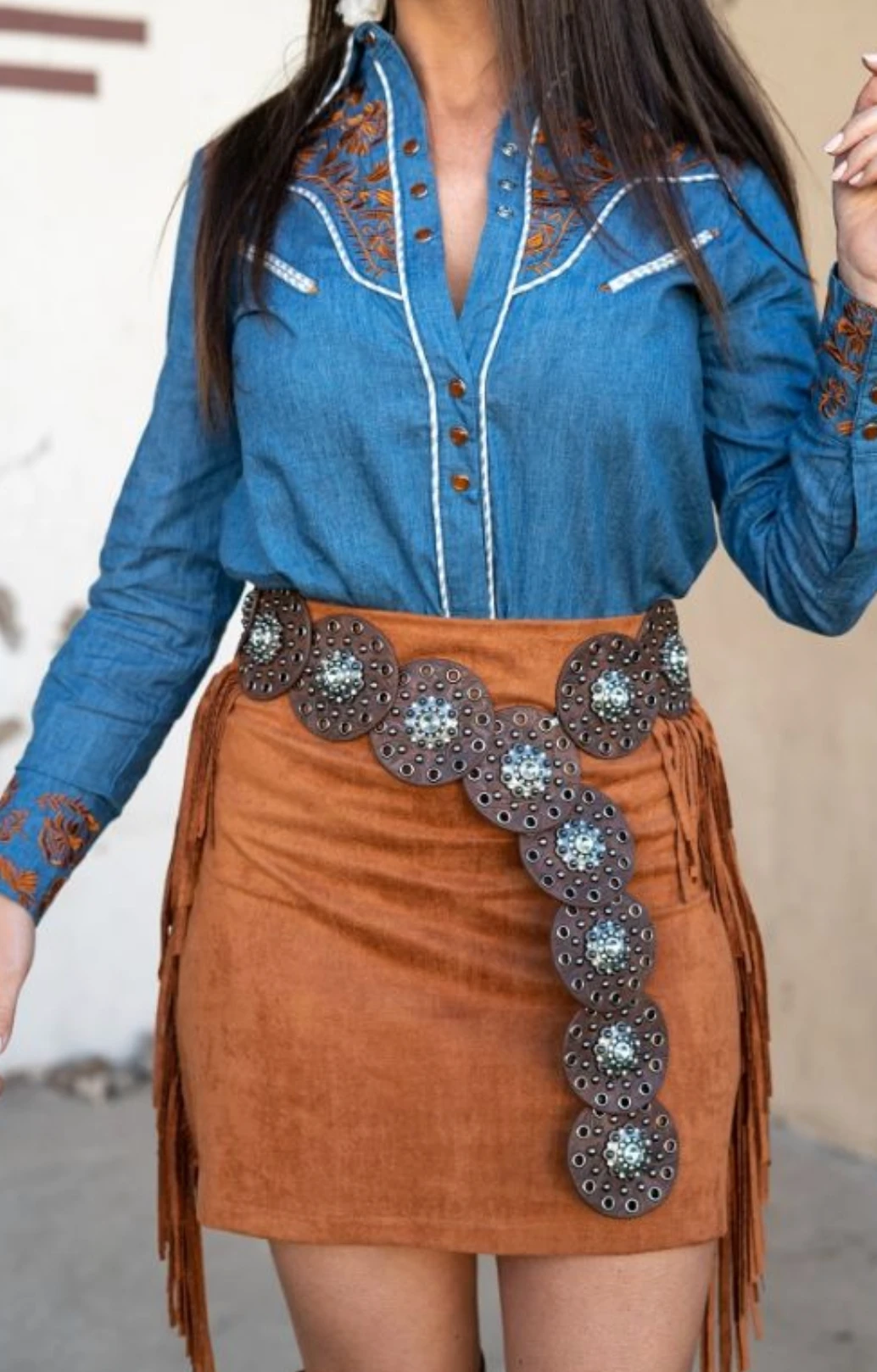 Vintage brown tooled belt displaying silver stone details. This belt could be worn to spice up any outfit! The clip will latch on to any concho, making it perfect to wear tighter, or a little looser.Â