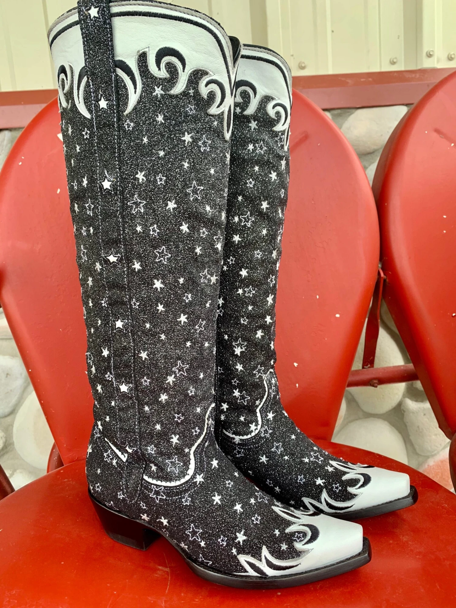 - Oh my STARS! Have you ever seen anything so gorgeous! These new beauties from Old Gringo are nothing short of perfection. They are black with white stars and white design across the top and across the toe. The glitter throughout makes them shine like the sky!!Â