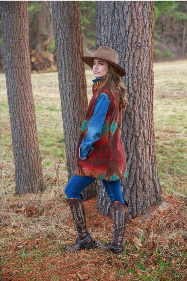 This western vest is sure to keep you warm all winter long! Its long length and soft, plushy fabric are perfect as a statement outerwear piece when the temperature drops! The shell is 70% polyester and 30% acrylic, while the trim and lining are 100% polyester.