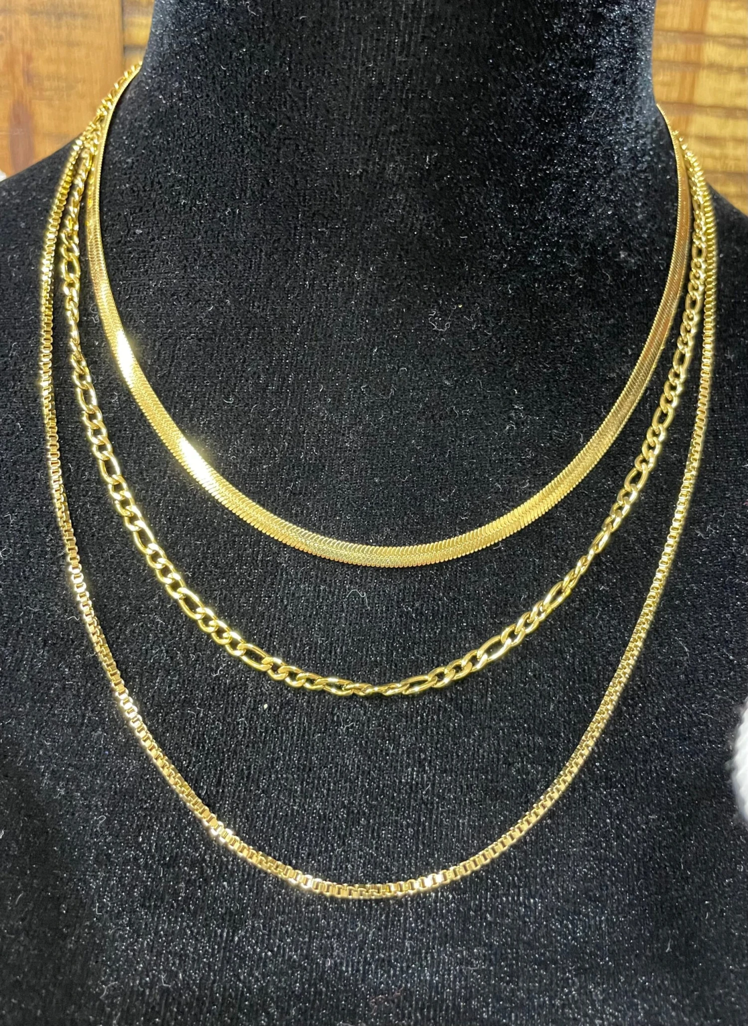 The Venice Triple Layer Gold Necklace is just so sleek and sexy! Three different styles of chains to make up one gorgeous piece of art! Beautiful!